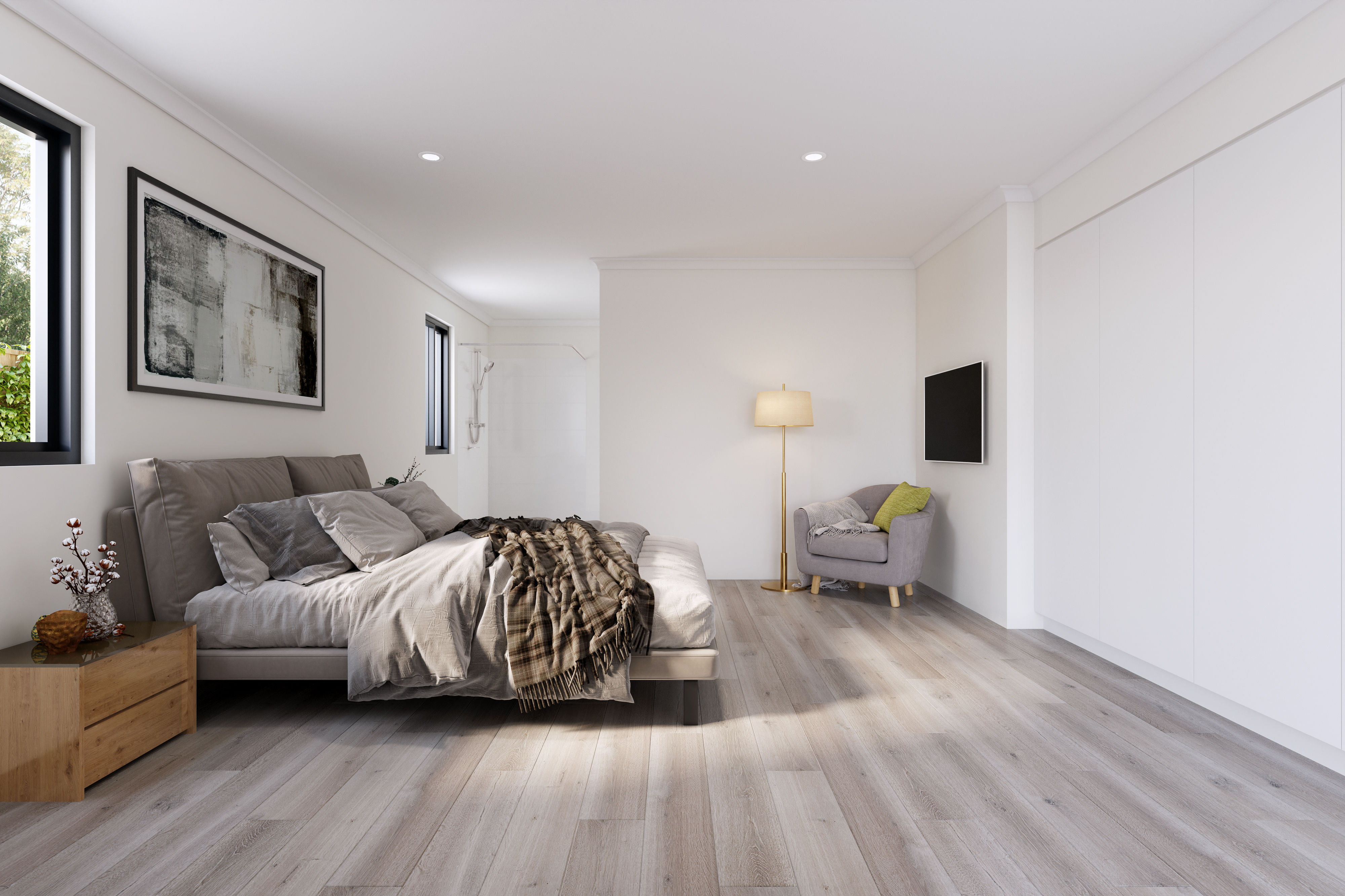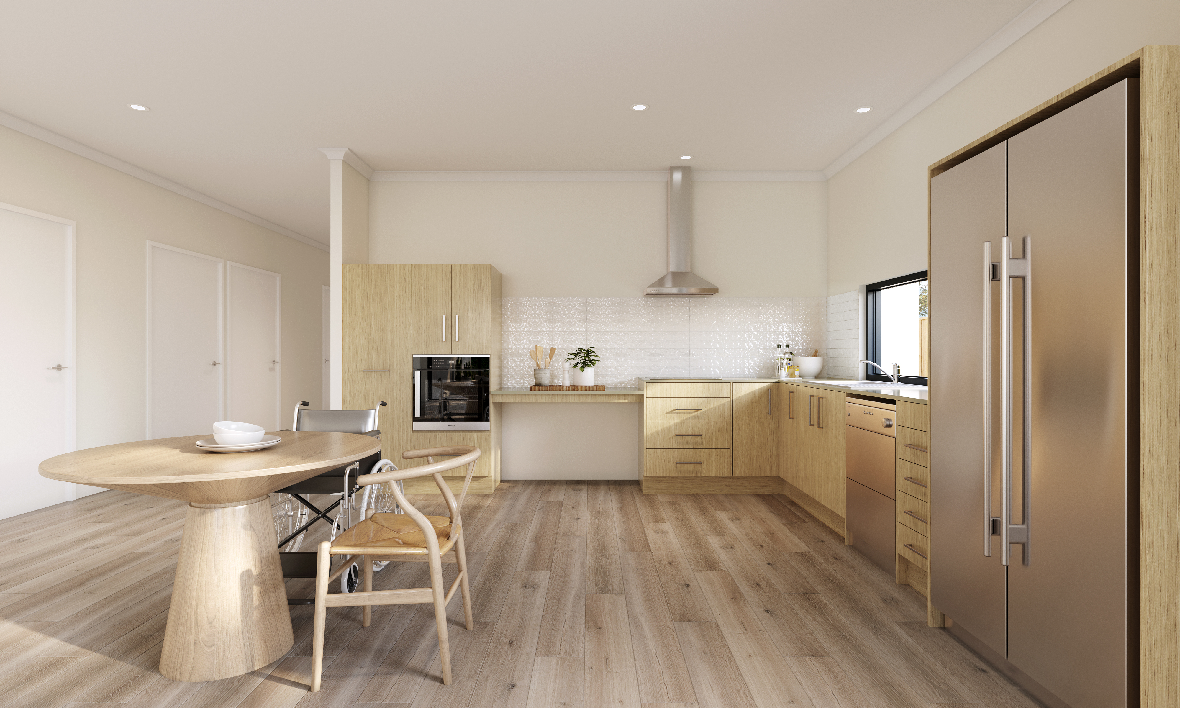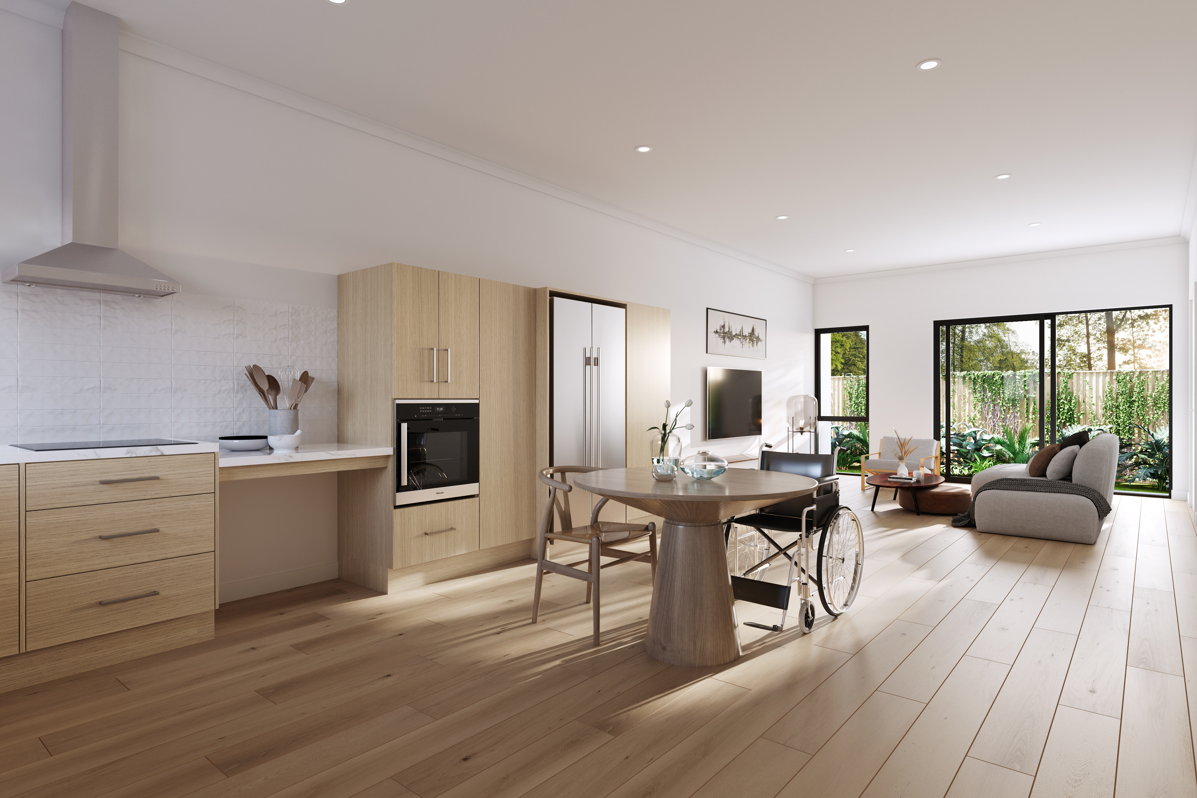 Each is equipped with built-in robes, private ensuite bathrooms featuring accessible showers, and adjacent wheelchair maneuvering space. - Open-Plan Kitchen / Dining / Living